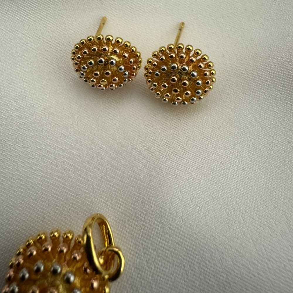 Radiate pure charm with the Aurum Bloom Set — a timeless trio of gold-plated earrings and pendant that shine with elegant sophistication. Its intricate beaded texture mimics the soft bloom of a flower, catching light beautifully from every angle.